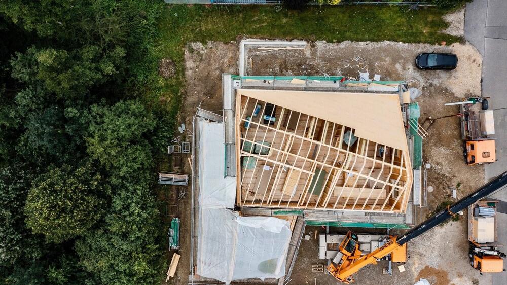 Und was dabei herauskommt, wenn man den Winkel des Dachstuhls dreht, zeigt das Foto unserer Praxis von oben. Weil uns das schiefe Dach so gut gefiel, haben wir diese Asymmetrie in die Raumaufteilung übernommen und so viele individuelle Räume geschaffen. Von außen sieht man davon die schräge Traufe. Im Inneren des Gebäudes folgen viele Wände dem Dachfirst.