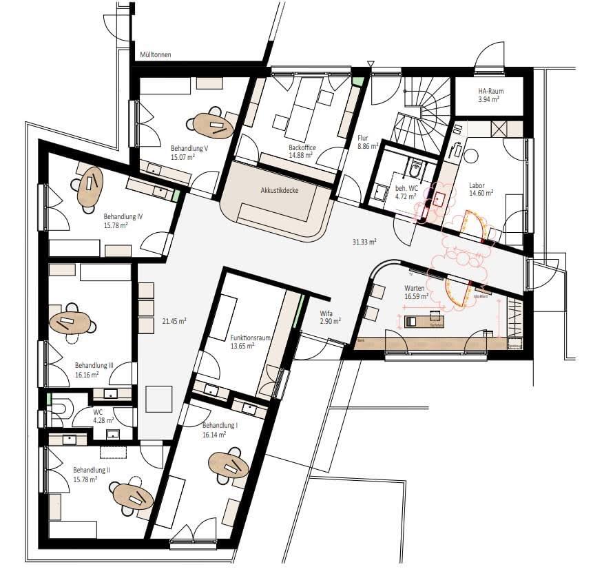 Nützliche Gebäude mit gleichförmigen, zweckmäßigen Räumen gibt es schon genug. In einer Hausarztpraxis soll aber auch Raum für Individualität und einen anderen Blickwinkel sein.